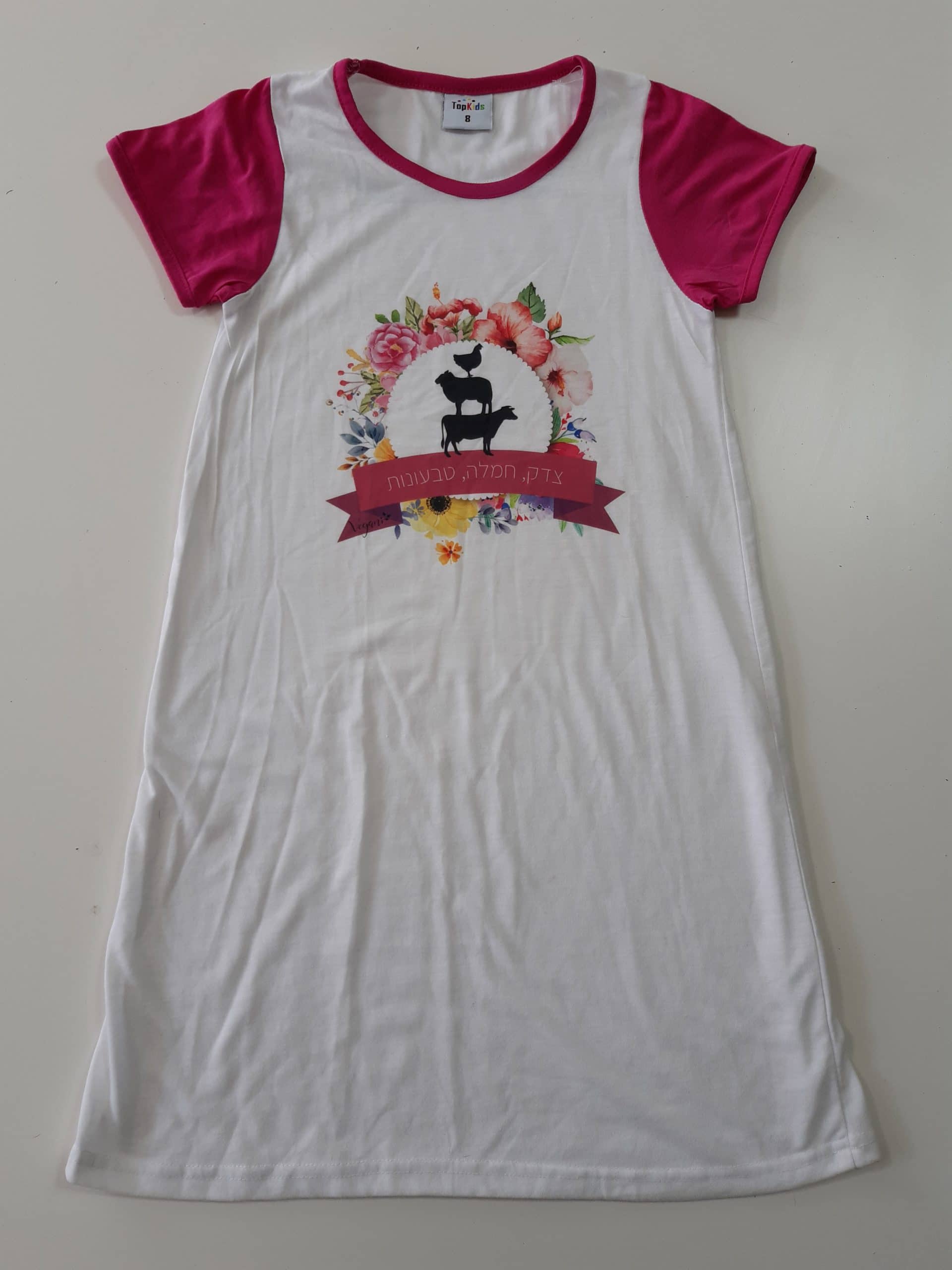 כותונת לילדה בצבע לבן עם שרוולים קצרים בצבע וורוד.